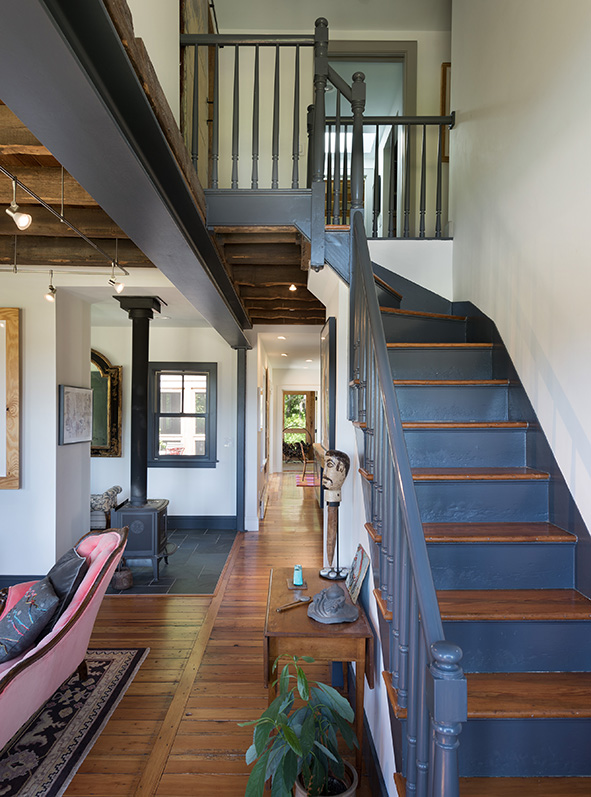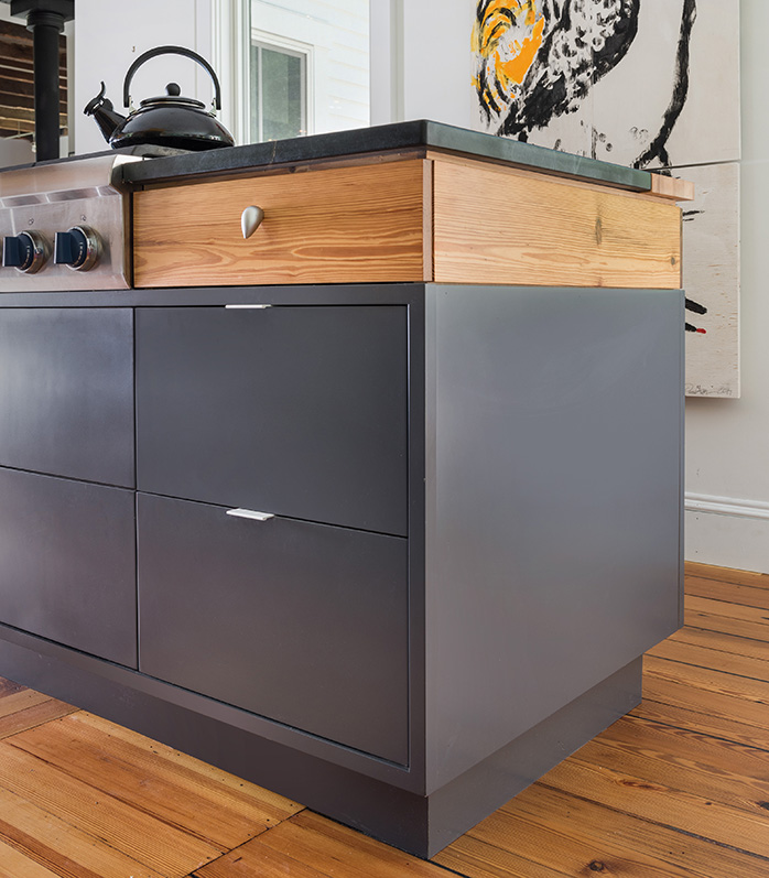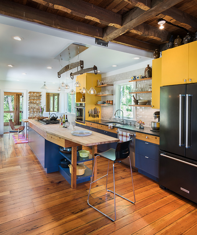 On the interior, the original structure is celebrated through the exposed ceiling rafters as well as the resurfaced hardwood floors throughout. Opening up the living space on the first floor and removing select load-bearing walls called for the addition of a steel beam, which added an industrial yet modern twist to the home. This theme of modernization is especially prevalent in the kitchen, where the the material combinations and color selections of the cabinetry – all custom and done here in our shop – create a vibrant and stimulating space.