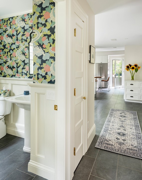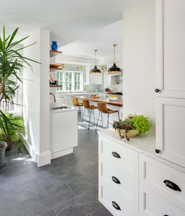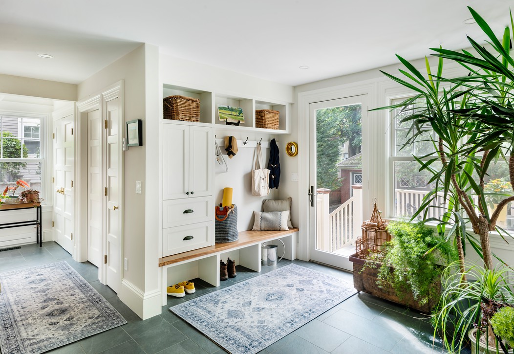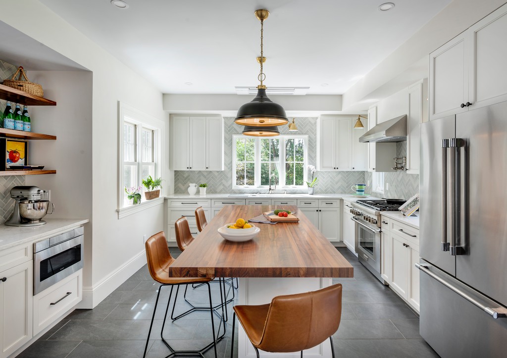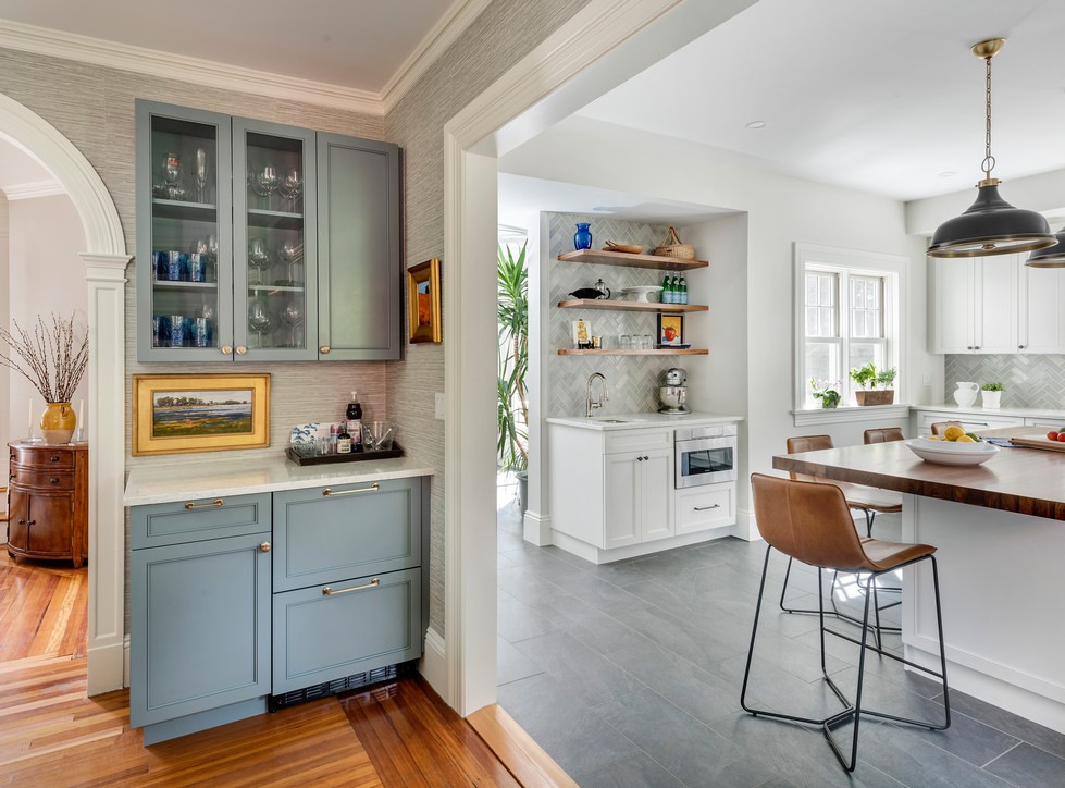 These clients approached SoC looking for an addition to replace their tight, dark, separated kitchen and equally deficient master bathroom above. On the ground floor, we took over a large sun-cooked deck and converted it to an interior space, locating a highly functional kitchen within, and the old kitchen location was reworked into a back entry with mudroom and powder room. Altogether, the result is a bright, well connected sequenceof spaces that now interact with the rest of the historical home, allowing sunlight and circulation back into the home’s existing central space.