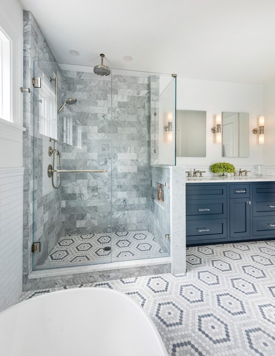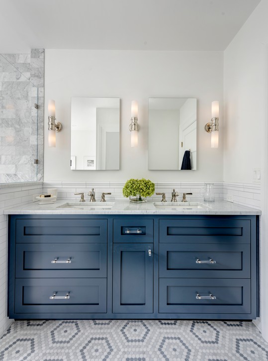 On the second floor, a small addition housing a new ensuite master bathroom sits above the new kitchen on the south face. Boasting a free-standing tub, comfortable walk in shower, water closet, and double vanity, it packs a huge amount of function into a slender space. The client’s palate of varying marble tile and counter surfaces paired with a rich blue vanity help to create a calming, soothing area.